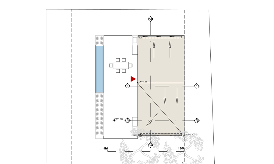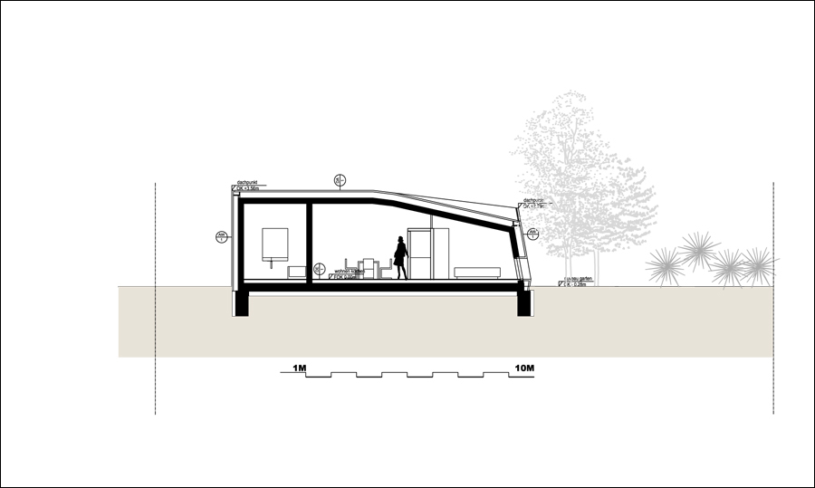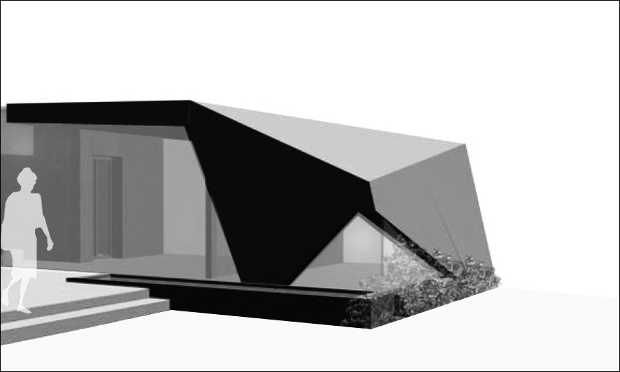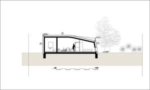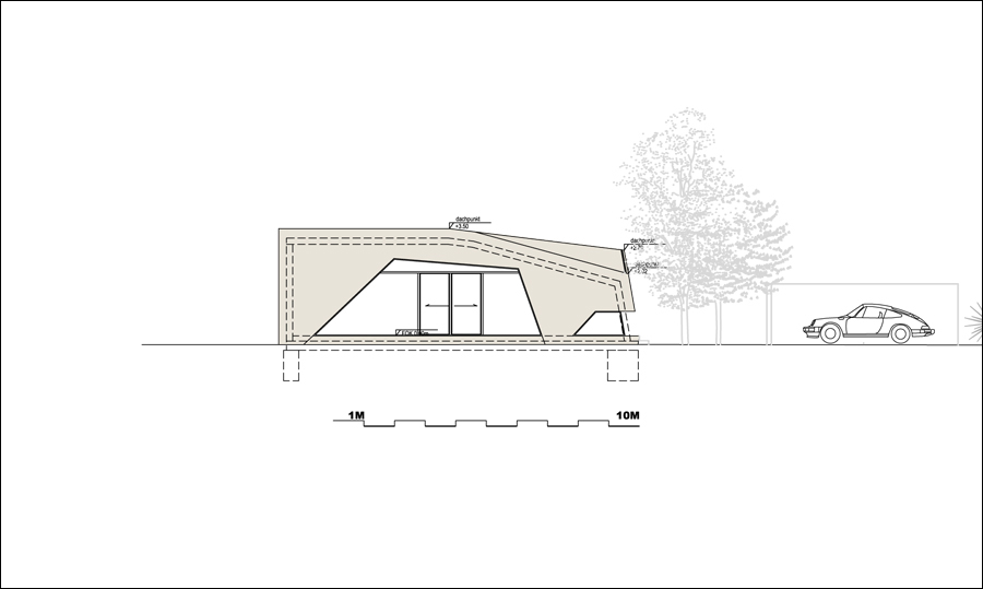 Der schlichten Anordnung des Grundrisses steht die geknickte Schale gegenüber, die gleichzeitig Dach und Seitenwände bildet.