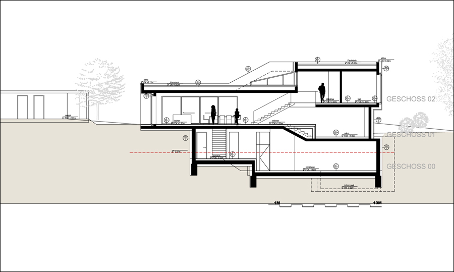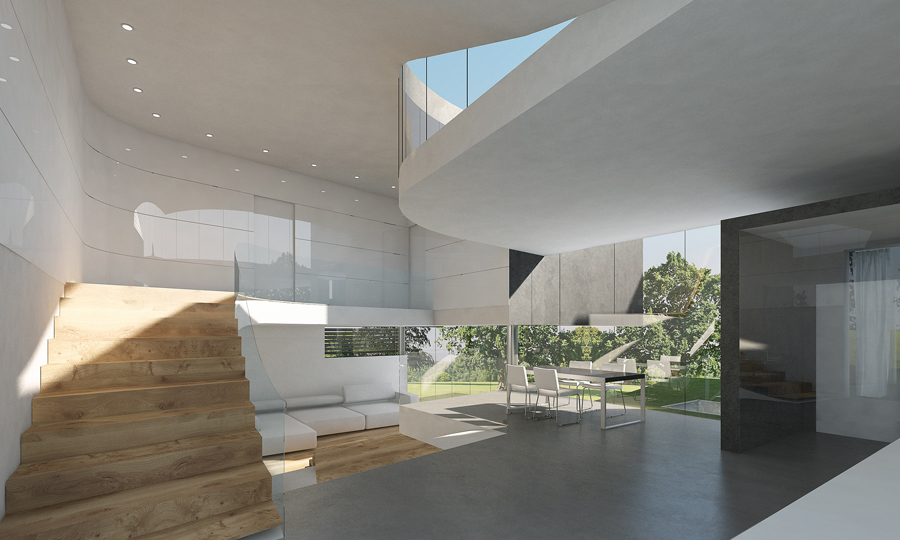 Das Projekt zeichnet sich durch eine Anordnung der Wohnbereiche auf mehreren Ebenen aus (Splitlevel). Diese Anordnung bewirkt eine räumliche Zonierung aber die Räume werden nicht von einander abgetrennt, sondern gehen fließend ineinander über.